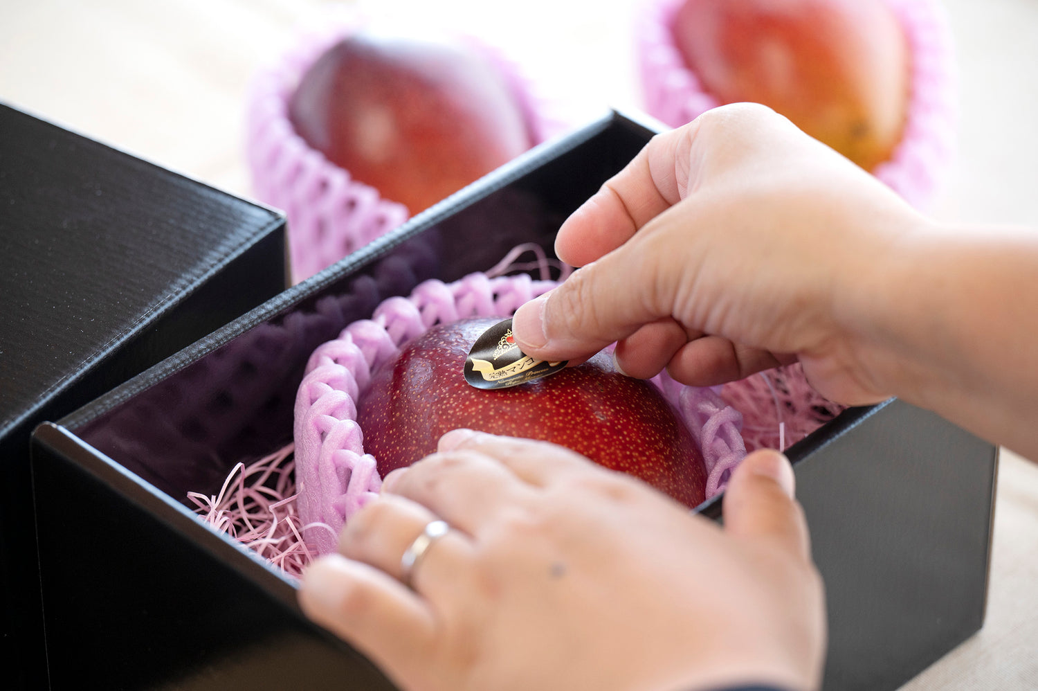栄果のマンゴーはひとつひとつお姫様のように、大切に大切に愛情をたっぷり込めて育て上げています。そうしてたくさんの愛情を注がれて誕生した真紅の実を「なめがたプリンセス」と名づけました。